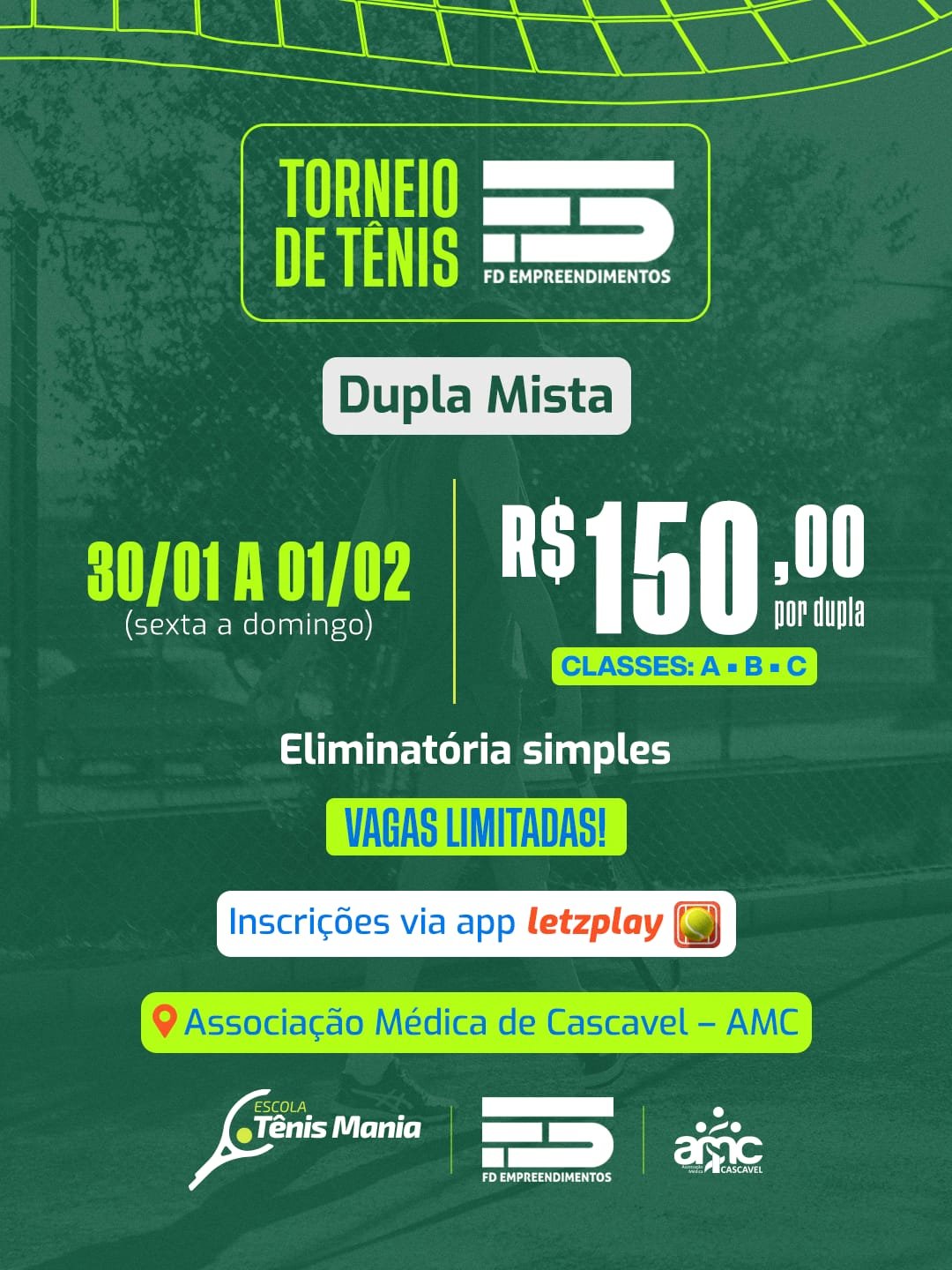 A Associação Médica de Cascavel (AMC) recebe o Torneio de Tênis – Dupla Mista FD Empreendimentos, um evento esportivo que une competição, integração e lazer. A competição acontece de 30 de janeiro a 1º de fevereiro, de sexta a domingo, nas quadras da AMC, e é destinada a duplas mistas das classes A, B e […]