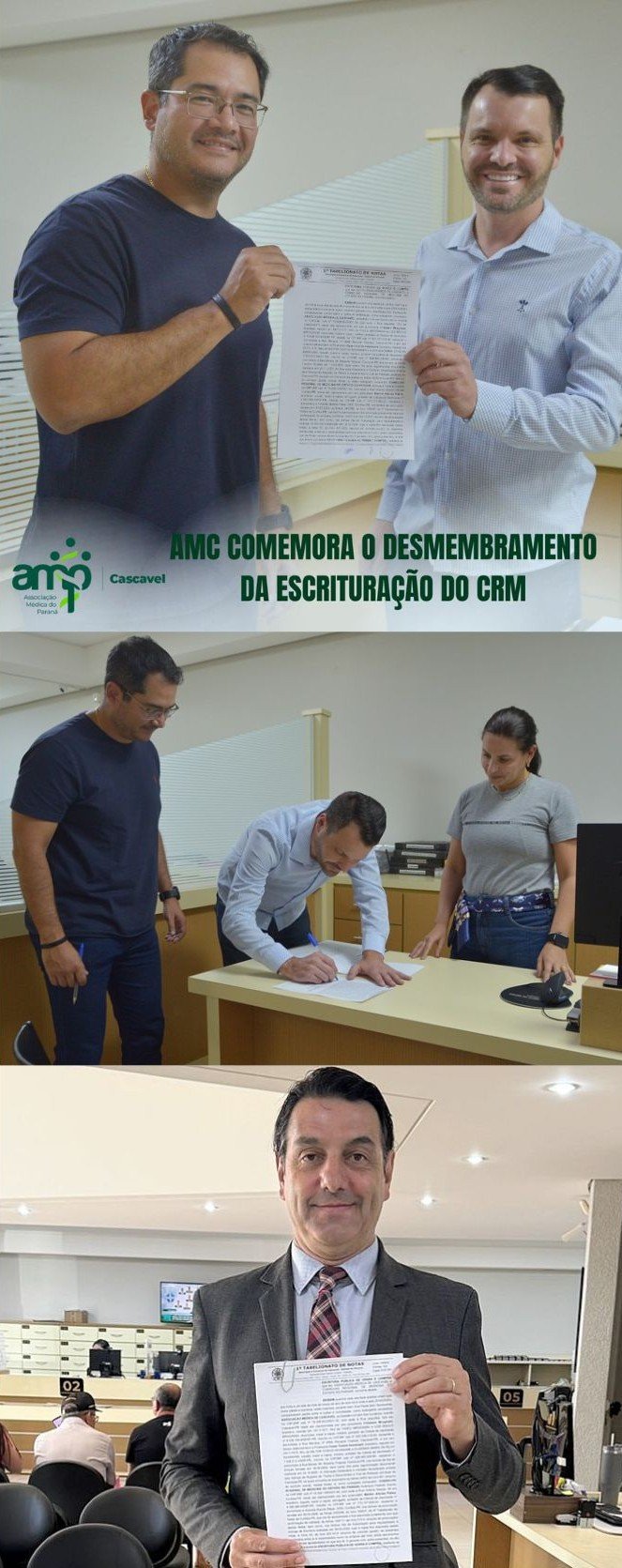 A assinatura do desmembramento contou com a presença do presidente da AMC, Dr. Cristiano Mroginski; do diretor administrativo e financeiro, Dr. Cesar Kawakami; de Ana Paula Zeni, do 1º Tabelionato de Notas; e do coordenador jurídico do CRM – PR, Martim Afonso Palma.